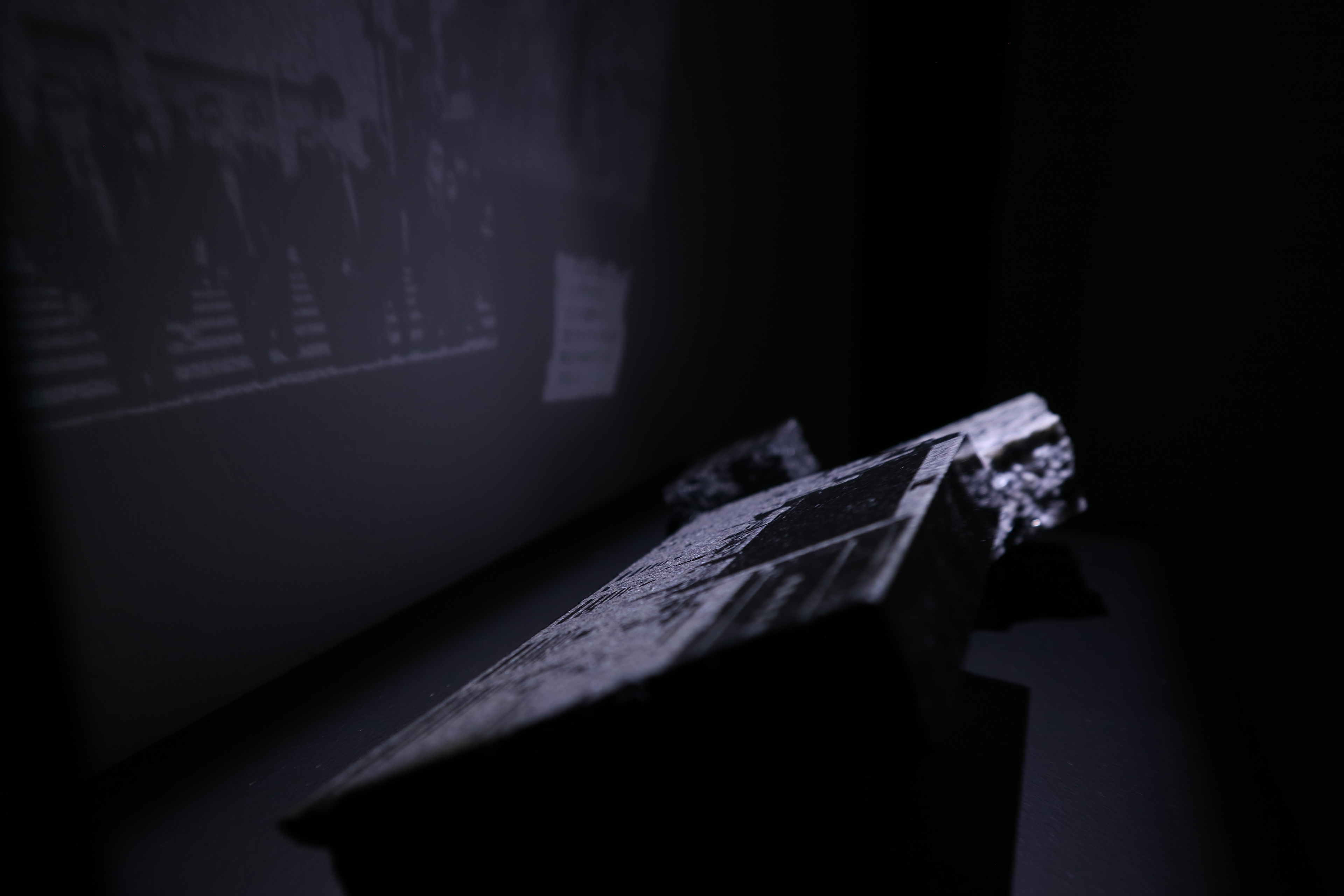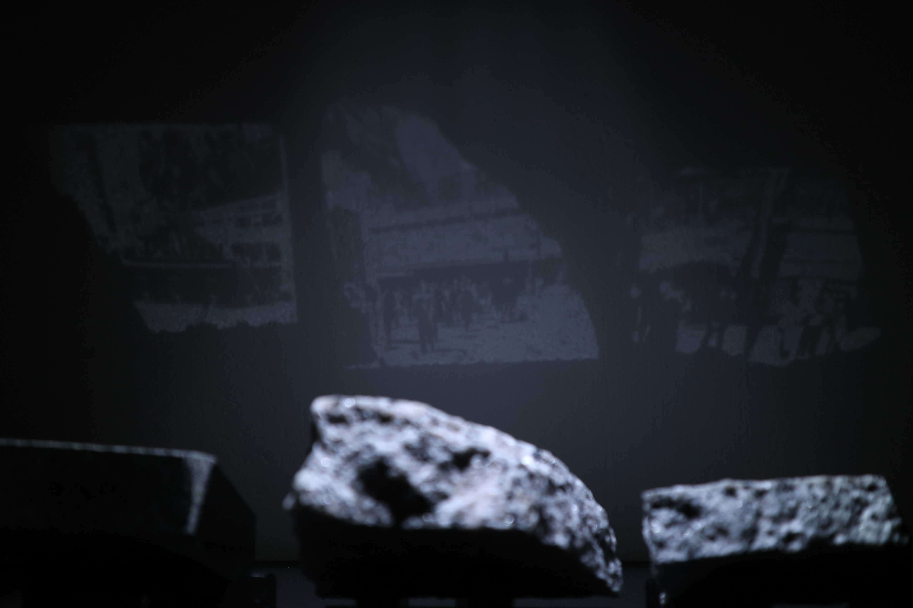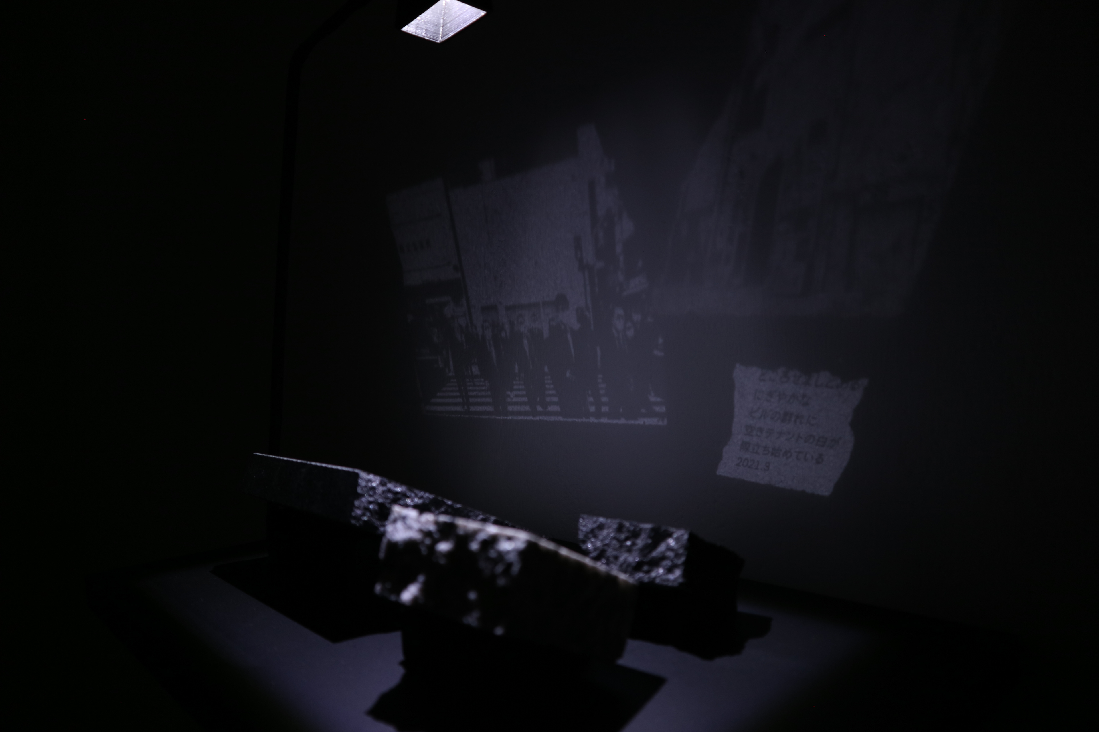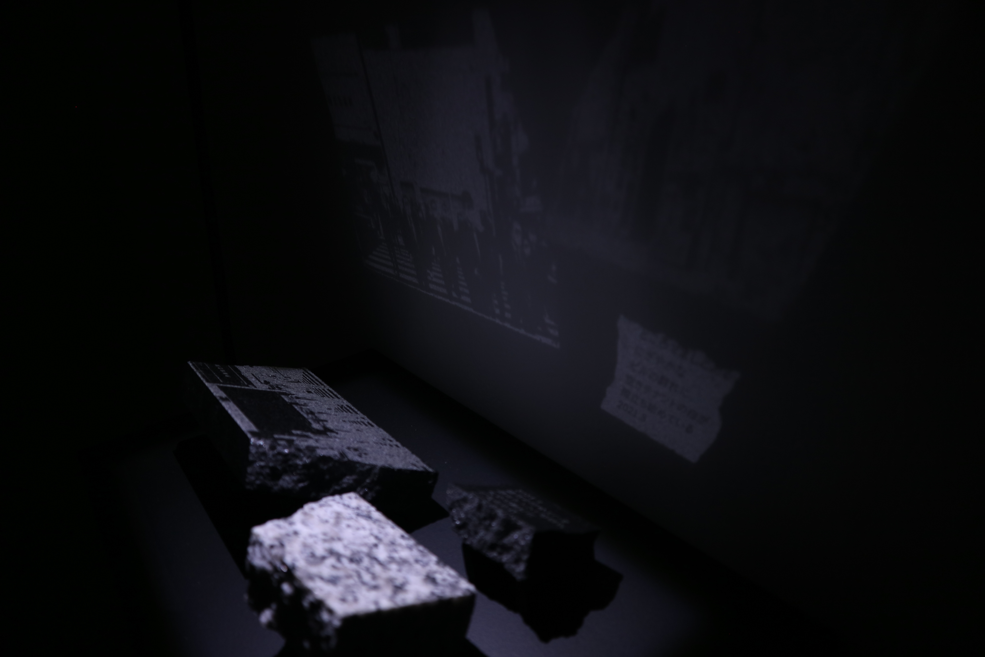 本作品は、鏡面加工された石にレーザー加工機を用いて文字やiPhoneで撮影した写真を彫刻加工し、加工を施した石の表面に光を当て、反射した光によって像を壁面に写し出している。